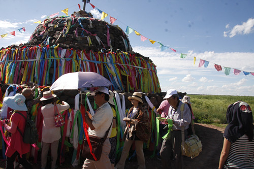 參加“情系燕趙”活動的臺灣嘉賓按照蒙古族風俗在敖包祭祀(中國臺灣網 蕪同 攝)