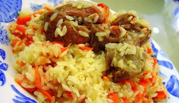 手抓飯是新疆維吾爾族菜品,主要的原料是用新鮮羊肉,胡蘿卜、洋蔥、清油、羊油和大米。做法是先將羊肉剁成小塊用清油炸,然后再放洋蔥和胡蘿卜在鍋里炒,并酌情放些鹽加水,等二十分鐘后,再把洗泡好的大米放入鍋內,不要攪動,四十分鐘后,抓飯即熟。做熟的抓飯油亮生輝。味香可口。維吾爾族把抓飯視為上等美餐。