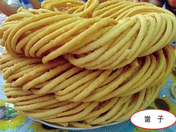 制作時(shí),應(yīng)根據(jù)馓子的大小,把餳好的面揪成小面劑,放到面案上搓成細(xì)長條,對折幾次,很快放到滾熱的羊油鍋里炸熟。羊油馓子晾涼后,表面裹著一層潔白的羊油,看上去黃、白相間,很有特色。
