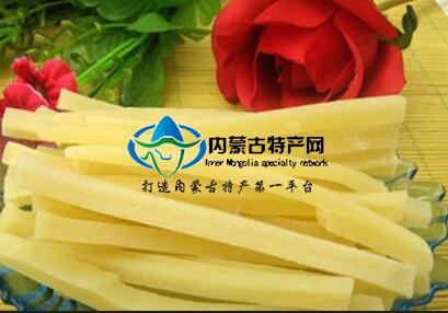 硬質酸奶酪,主要是蒙古族居民所生產與食用,也是他們十分喜愛的一種奶食品。他們所生產的奶酪,又俗稱“酪蛋子”,奶酪條,是蒙古居民,在制作干奶酪時候,壓制成條狀,便于攜帶,以及儲存。壓制成條狀,也利于方便食用。 奶酪,分生奶酪和熟奶酪兩種。 生奶酪的做法是,把鮮奶倒入筒中,經過翻攪提取奶油后,將純奶放置在熱處,使其發酵。當鮮奶有酸味后,再倒入鍋中煮熬,待酸奶呈現出豆腐形狀時,將其舀進紗布里,擠壓除去水份。然后,把奶渣放進模具或木盤中,或擠,大多都在行囊中放幾塊奶酪,以防不測,備以充饑解渴。 壓成形,或用刀劃成方塊,生奶酪就制做成功了。 熟奶酷的做法與生奶酪的做法略有不同。制做熟奶酪時,先把熬制奶皮剩下的鮮奶,或經過提取奶油后的鮮奶,放置幾天,使其發酵。當酸奶凝結成軟塊后,再用紗布把多余的水份過濾掉,放入鍋內慢煮,并邊煮邊攪,待呈糊狀時,將其舀進紗布里,擠壓除去水份,然后,把奶渣放進模具或木盤中,或擠壓成形,或用刀劃成不同形狀。奶酷做成后,要放置在太陽下,或者通風處,使其變硬成干。 對于奶酪條,也可以制作成菜肴。